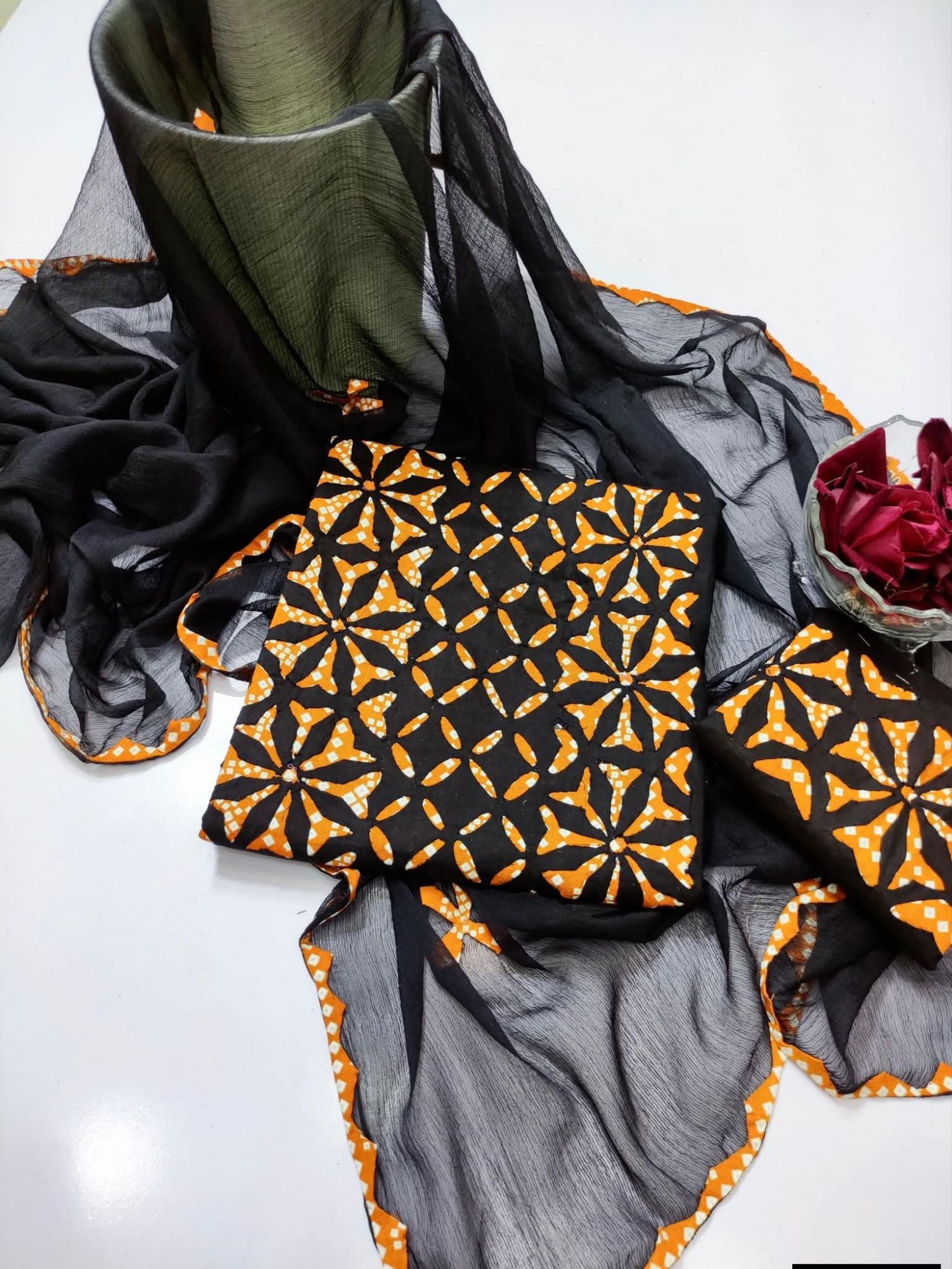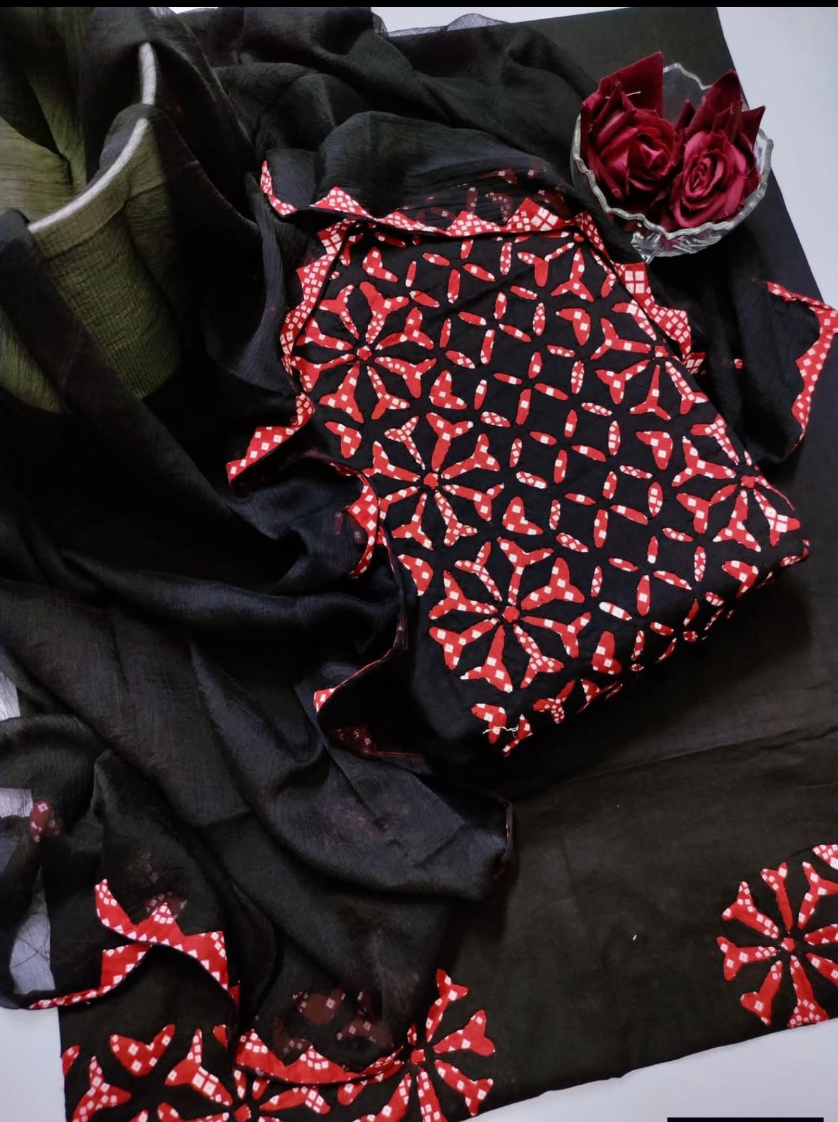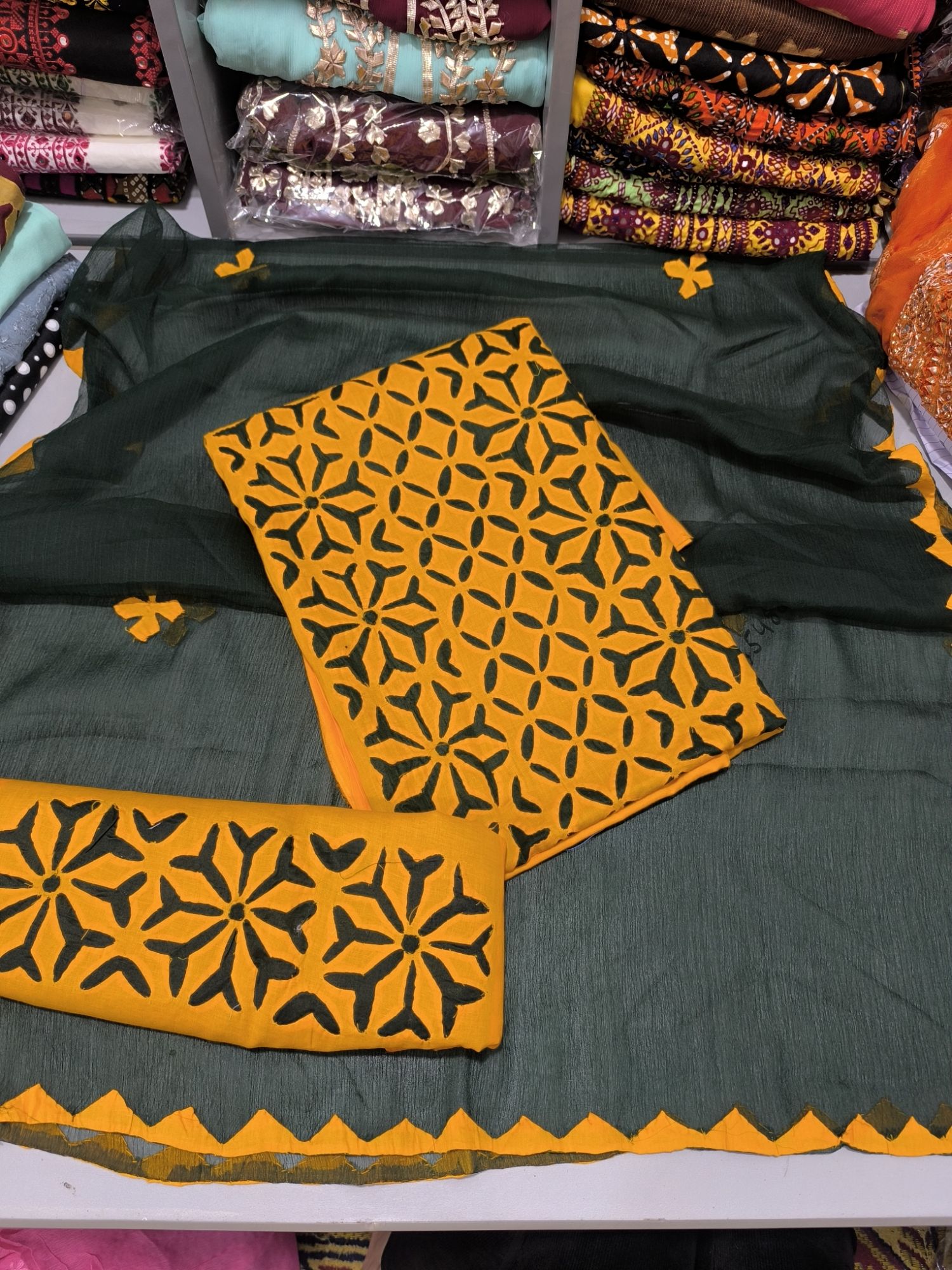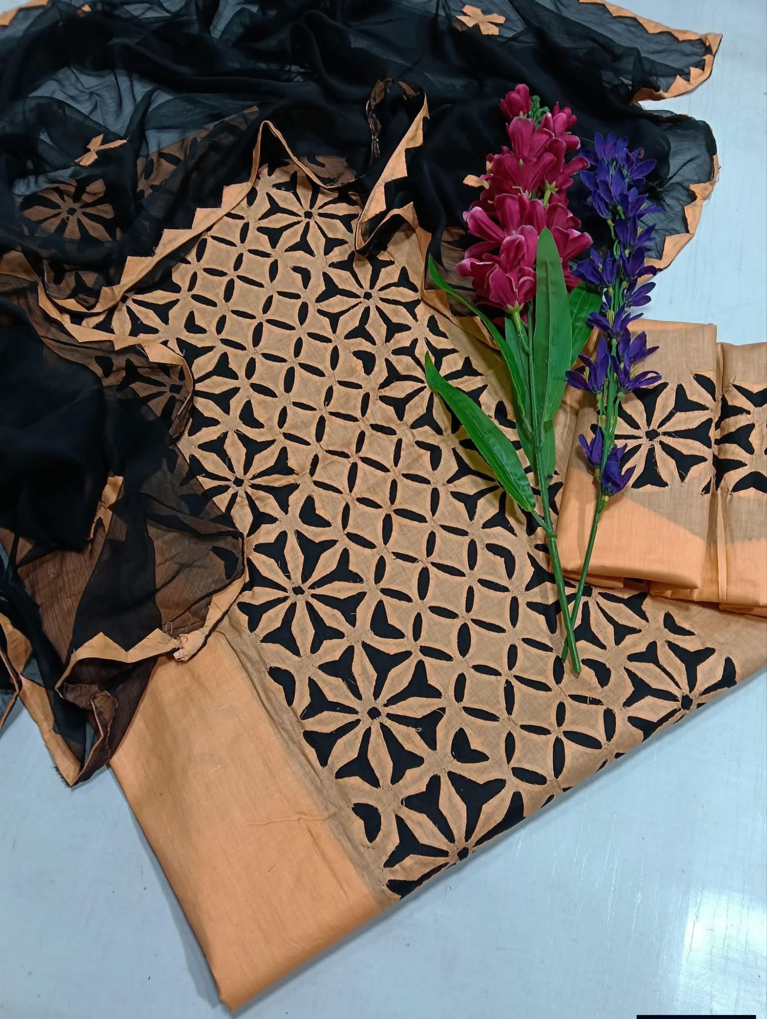 front full applic , dupatta four sided border . back motif and sleeves border